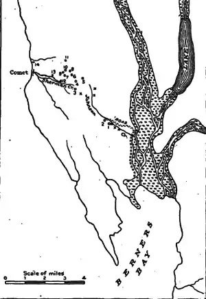 Berners Bay map with locations of key mines: 1-Jualin, 3-Comet, 4-Northern Belle, 6-Eureka, 7-Bear, 8-Kensington, 9-Savage, 10-Horrible, 11-Mellen