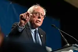 Fundraising totals are closely watched because they are an indicator of a candidate's support. Within three-and-a-half hours after his announcement, Sanders had raised over $1 million from small donations from all 50 states, quickly overtaking the amount rival candidate Kamala Harris raised in the first full day after her presidential announcement.[27] Within 12 hours, Sanders had raised over $4 million from 150,000 donors,[28] and in the first 24 hours following his announcement, Sanders raised $5.9 million from 225,000 individual donors, with the average donation being $27.[29] Within a week of his announcement Sanders had raised $10 million from 359,914 donors; donors who did not donate to his 2016 campaign stood for 39% of the donations, and registered Republican donors numbered approximately 12,000.[30] By April 1, Sanders had raised $18.2 million, leading the amounts raised by all other Democratic candidates. About 20 percent of donors were new supporters and the average donation was $20.[31] On July 2, Sanders campaign manager Faiz Shakir announced to reporters that the campaign had raised $18 million in the second quarter of 2019 in addition to having transferred an additional $6 million from other campaign accounts. Shakir added that 99% of the donations were $100 or less with an average contribution size of $18 and that the campaign received 2 million the day after the Miami Democratic debate.[32] On July 31, Shakir announced that the Sanders campaign had raised 1.1 million from over 70,000 donations since the Detroit Democratic debate the previous night, which Shakir credited Sanders for commanding and using to leave "absolutely no doubt that he is the best candidate ready to take this fight to Donald Trump and finally bring the change we need to America."[33] As with his 2016 campaign, donors have the option to donate exactly $27 to the campaign, the average amount donated to Bernie at one point in the 2016 campaign. On September 19, 2019, Sanders' campaign announced that they had reached 1 million individual donors, becoming the fastest presidential campaign in history to achieve that milestone.[34]