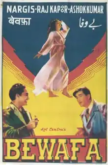 Bewafa (lit. 'Disloyal') is a 1952 Indian film directed by M. L. Anand, starring the hit Bollywood pair Nargis, Raj Kapoor, along with Ashok Kumar as a lead actor and he appears as a painter in the movie. It is considered one of the best films of the pair Raj Kapoor and Nargis.