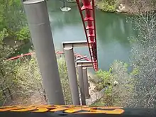 The train then entered a set of Block Brakes. Following the brakes, the train then turned right, and began to ascend a second lift hill. The second lift hill climbed towards the park's mock Rhine River. At the top of the 100-foot (30 m) lift, the ride turned 90 degrees to the left, before traveling down the climatic 80-foot (24 m) drop, barreling straight towards the river at 48 miles per hour (77 kilometres per hour), swooping to the left in close proximity to the water.