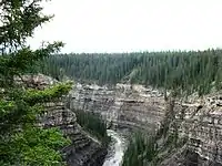 Flowing under Mount McGuire, Bighorn River soon takes on Littlehorn and Sunkay Creeks, before plummeting over the impressive Crescent Falls. After the falls, the Bighorn travels through a significant canyon, before passing through the Bighorn Indian Reserve. The river then empties into the North Saskatchewan River after Lake Abraham.[2]