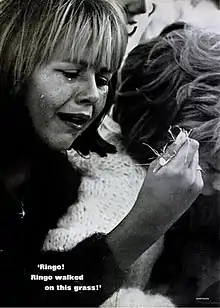 While still free-lancing Ray took photos of jazz bassist, Charles Mingus at a club in Greenwich Village and Elvis Presley just before his departure to serve as an Army Private in Germany.[8][9] A year later he did a photo shoot of Alan Freed's last television show as a payola scandal ended his career as a rock and roll disk jockey.[10] In what would eventually become the most famous of his photo assignments, Ray worked his way backstage onto a catwalk to shoot Marilyn Monroe in a skintight dress signing the happy birthday song to John F. Kennedy on the occasion of his forty-fifth birthday at Madison Square Garden in 1962.[11][1] [note 3] In 1963 Ray moved from New York to become a staff photographer in Life's Beverly Hills office.[13] Soon after arriving he spent two months photographing the actress, Natalie Wood.[13] A year later he took an arresting photo of a Beatles fan as the foursome arrived in Los Angeles for a west coast concert tour (shown at left).[14] It showed a tearful girl holding a clump of grass and had the caption ""Ringo! Ringo walked on this grass!"[note 4] That year he also produced a photo essay on the founder of Japan's largest consumer electronics company, Konosuke Matsushita.[16]