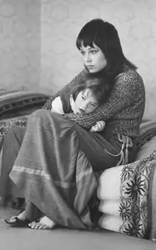 Much of Ray's subsequent work for Life consisted of celebrity shoots. In 1967 he took cover and six pages of photos showing Ingrid Bergman preparing for a role in a Broadway play.[21] A year later he accompanied the many paparazzi covering the Kennedy-Onassis wedding on Skorpiós.[22] In 1969 he contributed photos of Sharon Tate and Roman Polanski to an article about her brutal murder.[23] In 1971 he produced a cover story on the anti-war work of actress, Jane Fonda. Ray traveled with her for several weeks during which, he said, "she worked like a non-stop demon in a humorless and even grim manner." During that time he caught her in a pensive moment, relaxing briefly with her daughter, Vanessa (shown at right).[24]