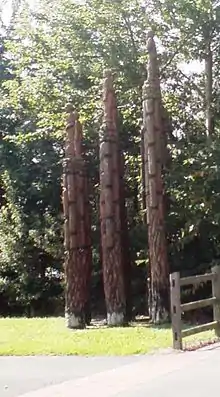At the Bilston end of the Black Country Route can be seen the group of wooden statues designed by Robert Koenig and called "Steel Columns." "This sculpture was made from 15 lengths of sweet chestnut which stretch up to 6 metres in height. The male and female figures depicted are based on those found in old Victorian photographs of Bilston. The title Steel Columns is a reference to Bilston's steel making background and the connection the figures had with this history."[22]