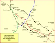 The Dudley branch had been cut back in the original BW&DR authorisation, to merely reach the South Staffordshire Railway's line, with running powers over it on to Dudley. The South Staffordshire Railway had to complete their line to Dudley within three years or the BW&DR could take it over; they did so, but it was a close run thing.[17]