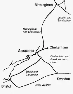 ![]() Sketchmap of the Birmingham and Gloucester Railway and its relationship to other lines | |