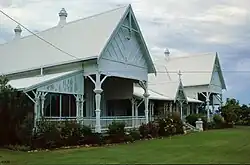 The architect has used this position to advantage, creating a striking house which is a flamboyant blend of Victorian Gothic and vernacular architecture; perhaps appropriate for an English church transplanted to tropical Australia. It also responds well to the climate with wide verandahs right around the house to obtain the best of both breeze and view. A terrace at the front of the house has a lawn with trees and flowering shrubs.[1]