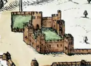 The surviving gatehouse resembles the architecture of Caerphilly Castle, which may indicate that the same master mason worked on both fortifications.[5] This would date the Palace to the time of William de Braose who became Bishop of Llandaff in 1266.[5][6] It is believed the Palace was attacked and damaged by Owain Glyndŵr in the rebellion of 1402–05, and was subsequently abandoned by the bishop of the period,[5] who moved to live at Mathern Palace in Monmouthshire; bishops did not return to live near their cathedral again until 1850. The Bishops Palace was intact in 1610 when it was shown in a plan by John Speed, but was probably destroyed during the English Civil War.[7]