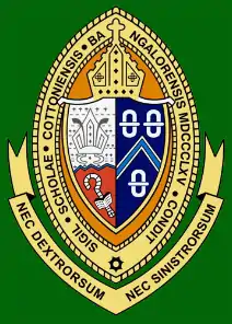 The crest of the shield is the family crest of Bishop Cotton of Calcutta. The crest is divided vertically - the right side (dexter) has the arms of the Bishop of Calcutta. The Bishop's mitre on top is green on a white background and the staff and open Bible are in the bottom half on a red background. The left side (sinister) has three skeins of cotton and a chevron (inverted v) on a blue background. This side represents the ancient house to which Bishop Cotton belonged. The crest thus symbolises the godliness, service and courage for which the school stands.