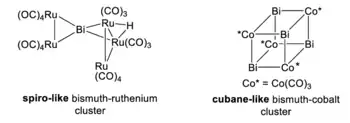 Spiro-like clusters such as [{Ru2(CO)8}(µ4-Bi){(µ-H)Ru3(CO)10} and cubane-like ones as [Bi4Co*4] are representatives as well.[2] The former displays a tetracoordinate bismuth metallic center along with a dicoordinated hydride ligand. The structure of the latter is cubic with the edges alternating bismuth and cobalt metallic centers.
