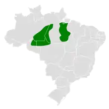 The black-bellied gnateater is endemic to Brazil. (A single 1889 specimen from Bolivia has been attributed to this species, but it was described as a different one. No other occurrences of black-bellied gnateater in Bolivia have been reported.) Its range includes two disjunct areas within the south-central Amazon Basin. One population occurs south of the Amazon from the eastern bank of the northeast flowing Madeira River east to the lower Tapajós River and south to the northern parts of Rondônia and Mato Grosso states. The other population also occurs south of the Amazon, between the Xingu River and the lower Tocantins River.[5]