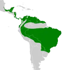 It is found in Argentina, Belize, Bolivia, Brazil, Colombia, Costa Rica, Ecuador, French Guiana, Guatemala, Guyana, Honduras, Mexico, Nicaragua, Panama, Paraguay, Peru, Suriname, Trinidad and Tobago, and Venezuela. Its natural habitats are subtropical or tropical moist lowland forests and heavily degraded former forest.