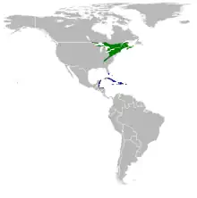 The species breeds in North America and winters in the Caribbean. Some studies have observed significant differences in terms of migratory behavior and plumage color between northern and southern populations within the breeding range.[4] The northern population mainly winters in the western Caribbean (Cuba and Jamaica) while the southern population usually spends the winter on eastern islands (Hispaniola and Puerto Rico). Moreover, males in the southern population have darker plumage than those in the northern population. These differences have led biologists to consider them as separate subspecies. However, a recent study in the United States reveals no significant genetic differentiation between northern (samples from Michigan, New Hampshire and New York states) and southern populations (sample from North Carolina).[5] The study results actually show a recent population expansion from a single glacial refugium, therefore the current populations are homogeneous in terms of genetics. The differentiation that is observed between the northern and southern populations should have occurred quite recently.[5]