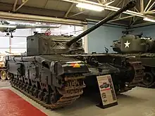 A larger gun than that carried by a conventional Churchill required a larger turret on a wider turret ring and consequently a widening of the tank hull. The Black Prince weighed around ten tons more than the Churchill so the suspension was modified and the tracks widened by 10 inches to carry the extra load. However, the Churchill's 350-horsepower (260 kW) engine was retained, leading to the tank being underpowered and slow, with maximum speeds 10.5 mph (16.9 km/h) on roads and 7.5 mph (12.1 km/h) cross country. This was so slow that the tank's tactical usefulness would have been limited.[2] Consideration was given to the use of the Rolls-Royce Meteor engine; this would have increased the available power to 600 hp (450 kW), but the idea never left the drawing–board.[2] Likewise, plans to fit the Black Prince with the turret from the Centurion were never carried out.[2]