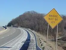Bridges and overpasses can be especially dangerous. Black ice forms first on bridges and overpasses because air can circulate both above and below the surface of the elevated roadway when the ambient temperature drops, causing the pavement temperature on the bridge to fall rapidly.[9] In the United States, road warning signs with the advisory "Bridge Ices Before Road" indicate potentially dangerous roadways above bridge structures.