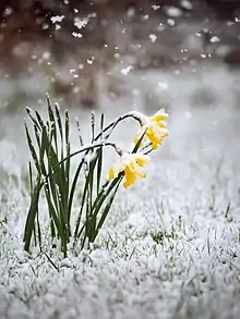Blackberry winter is a colloquial expression used in south, midwest North America; as well as in Europe, Sinosphere Vietnam and East Asia, referring to a cold snap that often occurs in late spring when the blackberries are in bloom. Other colloquial names for spring cold snaps include "dogwood winter," "whippoorwill winter," "locust winter," and "redbud winter." The different names are based on what is blooming in particular regions during the typical spring cold snaps.[1][2] Another colloquialism for these spring cold snaps is "linsey-woolsey britches winter," referring to a type of winter long underwear which could be put away after the last cold snap. The blackberry winter term may have arisen to describe the belief that a spring cold snap helps the blackberry canes to start growing.[3]