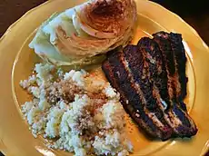 Blackening is a cooking technique used in the preparation of fish and other foods. Often associated with Cajun cuisine, this technique was invented and popularized by chef Paul Prudhomme.[1] The food is dipped in melted butter and then sprinkled with a mixture of herbs and spices, usually some combination of thyme, oregano, chili pepper, peppercorns, salt, garlic powder, and onion powder.[2] It is then cooked in a very hot cast-iron skillet.[2][3] The characteristic brown-black color of the crust results from a combination of browned milk solids from the butter and charred spices.[4]