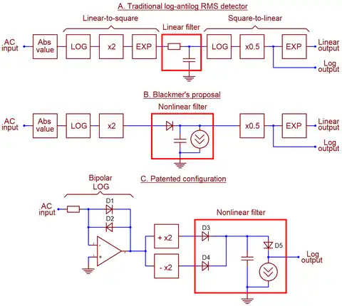 Unlike earlier RMS detectors that time-averaged algebraic square of input signal, the Blackmer detector performs time-averaging on the logarithm of the input, being the first successful, commercialized instance of log-domain filter.[1] The circuit, created by trial and error, computes root mean squared of various waveforms with high precision, although exact nature of its operation was not known to the inventor. First mathematical analysis of log-domain filtering and mathematical proof of Blackmer's invention were proposed by Robert Adams in 1979; general log-domain filter synthesis theory was developed by Douglas Frey in 1993.[2]