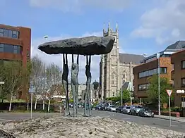 "Blackrock Dolmen" (1987) by Rowan Gillespie with the church St. John the Baptist in the background