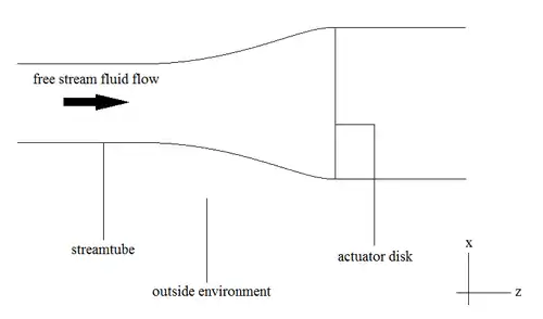 In our streamtube we have fluid flowing from left to right, and an actuator disk that represents the rotor. We will assume that the rotor is infinitesimally thin.[5] From above, we can see that at the start of the streamtube, fluid flow is normal to the actuator disk. The fluid interacts with the rotor, thus transferring energy from the fluid to the rotor. The fluid then continues to flow downstream. Thus we can break our system/streamtube into two sections: pre-acuator disk, and post-actuator disk. Before interaction with the rotor, the total energy in the fluid is constant. Furthermore, after interacting with the rotor, the total energy in the fluid is constant.