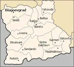 Blagoevgrad Province (Bulgarian: област Благоевград, oblast Blagoevgrad or Благоевградска област, Blagoevgradska oblast), also known as Pirin Macedonia or Bulgarian Macedonia (Bulgarian: Пиринска Македония; Българска Македония), (Pirinska Makedoniya or Bulgarska Makedoniya) is a province (oblast) of southwestern Bulgaria. It borders four other Bulgarian provinces to the north and east, the Greek region of Macedonia to the south, and North Macedonia to the west. The province has 14 municipalities with 12 towns. Its principal city is Blagoevgrad, while other significant towns include Bansko, Gotse Delchev, Melnik, Petrich, Razlog, Sandanski, and Simitli.