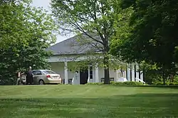 The current historic main house and outbuildings were built by politician and diplomat Andrew Stevenson in 1846. It is a 1+1⁄2-story, six-bay, gable-roofed frame building with Gothic Revival and Greek Revival style details. It has an ell at the rear of the west end. The front facade features a pair of one-story tetrastyle porches with pairs of Doric order piers. A notable outbuilding is the square "Athenaeum", a one-story, one-room, frame Greek Revival building with a pyramidal hipped roof and portico supported on Doric piers. Also on the property are a frame kitchen/laundry, a "chapel" or schoolhouse, and two smoke houses. Also on the property are two dwellings, one of which is supposed to have been built to accommodate Justice Roger B. Taney on his visits to Blenheim.[3]
