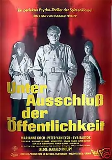 Blind Justice or Excluded to the Public (German: Unter Ausschluß der Öffentlichkeit) is a 1961 West German crime drama film directed by Harald Philipp and starring Peter van Eyck, Marianne Koch and Eva Bartok.[1]