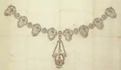 Its distinctive feature was a collar with golden medals chained one to the other. The medals showed two symbols alternatively: one medal showed the device of the melting pot surrounded by flames where some golden bars were being melted, while the other was decorated by the letters D.P., initial letters of the motto DOMINE PROBASTI ET COGNOVISTI ME taken from Psalm 138. The badge of the Order, made of gold, hanged from this collar and showed two angels holding a reliquary with three drops of Christ's blood in it. The medal had the motto NIHIL ISTO TRISTE RECEPTO on it.