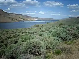 Blue Mesa Dam is located on the Gunnison river approximately 30 miles west of the city of Gunnison, near the intersection of U.S. 50 with Colorado Highway 92, which travels along the top of the dam. The reservoir extends east 20 miles and is composed of three main basins, the Iola, the Cebolla and the Sapinero, from east to west. U.S. 50 traverses the northern shore of both the Iola and Cebolla Basins before crossing the reservoir south on the Middle Bridge and continuing west to the dam.