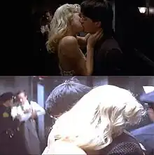 Despite Blue Velvet's initial appearance as a mystery, the film operates on a number of thematic levels. The film owes a large debt to 1950s film noir, containing and exploring such conventions as the femme fatale (Dorothy Vallens), a seemingly unstoppable villain (Frank Booth), and the questionable moral outlook of the hero (Jeffrey Beaumont), as well as its unusual use of shadowy, sometimes dark cinematography.[34] Blue Velvet represents and establishes Lynch's famous "askew vision",[35] and introduces several common elements of Lynch's work, some of which would later become his trademarks, including distorted characters, a polarized world, and debilitating damage to the skull or brain. Perhaps the most significant Lynchian trademark in the film is the depiction of unearthing a dark underbelly in a seemingly idealized small town;[36] Jeffrey even proclaims in the film that he is "seeing something that was always hidden", alluding to the plot's central idea. Lynch's characterization of films, symbols, and motifs have become well known, and his particular style, characterised largely in Blue Velvet for the first time, has been written about extensively using descriptions like "dreamlike",[37] "ultraweird",[38] "dark",[39] and "oddball".[40] Red curtains also show up in key scenes, specifically in Dorothy's apartment, which have since become a Lynch trademark. The film has been compared to Alfred Hitchcock's Psycho (1960) because of its stark treatment of evil and mental illness.[41] The premise of both films is curiosity, leading to an investigation that draws the lead characters into a hidden, voyeuristic underworld of crime.[42]
