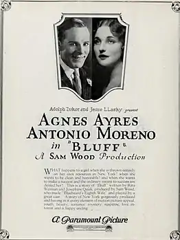 Bluff is a 1924 American silent drama film directed by Sam Wood and written by Willis Goldbeck, Josephine Quirk, and Rita Weiman. The film stars Agnes Ayres, Antonio Moreno, Fred J. Butler, Clarence Burton, Pauline Paquette, and Jack Gardner. The film was released on May 12, 1924, by Paramount Pictures.[1][2]