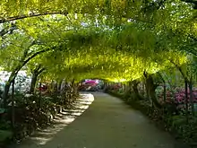 Bodnant Garden was visited by over 260,000 people in 2019[1] and is famous for its Laburnum arch, the longest in the UK, which flowers in May and June.[2] The garden is also celebrated for its link to the plant hunters of the early 1900s whose expeditions formed the base of the garden's four National Collections of plants – Magnolia, Embothrium, Eucryphia and Rhododendron forrestii.