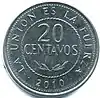 20 centavos 22 mm 3.25 g Nickel plated steel "LA UNIÓN ES LA FUERZA"; "20 CENTAVOS"; Date of issue 2010-2016