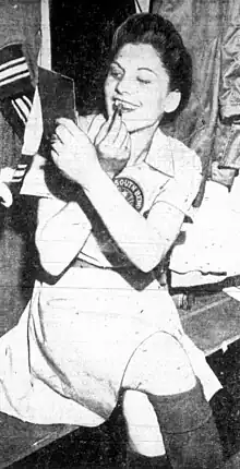 Saskatchewan Mary Baker's eight brothers and sisters were all baseball catchers, so it stood to reason that Baker would become one too. She was scouted by a professional scout, Hub Bishop[2] who also scouted notable Saskatchewan athletes like Gordie Howe of the Detroit Red Wings. When she joined the AAGPBL, she promised her husband, who was fighting overseas in World War II, that she would quit the game when he returned. Baker, 5'5", 135 lbs. (165 cm, 61 kg), a former model, was often chosen by the league to pose for publicity shots and act as a league spokesperson. Baker was the league's most publicized player and was referred to as "Pretty Bonnie Baker" by the press. She appeared on the popular television show What's My Line? on August 17, 1952, and her picture also appeared in Life magazine.