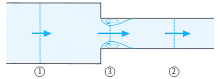 with A3 the cross-sectional area at the location of strongest main flow contraction 3, and A2 the cross-sectional area of the narrower part of the pipe. Since A3 ≤ A2, the coefficient of contraction is less than one: μ ≤ 1. Again there is conservation of mass, so the volume fluxes in the three cross sections are a constant (for constant fluid density ρ):