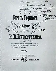 When Lyudmila Shestakova, the sister of Mikhail Glinka, learned of Mussorgsky's plans, she presented him with a volume of Pushkin's dramatic works, interleaved with blank pages and bound, and using this, Mussorgsky began work in October 1868 preparing his own libretto.[12] Pushkin's drama consists of 25 scenes, written predominantly in blank verse. Mussorgsky adapted the most theatrically effective scenes, mainly those featuring the title character, along with a few other key scenes (Novodevichy, Cell, Inn), often preserving Pushkin's verses.[13]