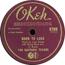 "Born to Lose" is a song written by Ted Daffan. Recorded by his band Ted Daffan's Texans, with vocal by Leon Seago, on February 20, 1942,[1] it was released as a double A-side single exactly one year later, at the height of the Second World War. This was Daffan's most successful record, as well as the most successful release of "Born to Lose"; it remained on the hillbilly chart for 82 weeks. The song has been covered by many artists, including Johnny Cash.[6] Probably the most famous version is found on Ray Charles's 1962 album Modern Sounds in Country and Western Music.[7] Released as a single (as a flip side to "I Can't Stop Loving You"), his recording peaked at number 41 on the Billboard Hot 100,[8] which earned Charles a platinum disc in 1962. Daffan's version of "Born to Lose" sold over one million copies, and was awarded a gold disc by the RIAA.[9]