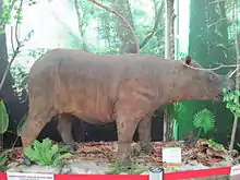 The Bornean rhinoceros (Dicerorhinus sumatrensis harrissoni), also known as the eastern Sumatran rhinoceros or eastern hairy rhinoceros, is one of three subspecies of Sumatran rhinoceros. The subspecies may be functionally extinct, with only one individual, a female named Pahu, surviving in captivity, and held in the state of Sabah.[1] In April 2015, the Malaysian government declared the Bornean rhinoceros to be extinct in the wild in the Malaysian portion of Borneo. However, in March 2016, a young female rhino was captured in East Kalimantan (in the Indonesian portion of Borneo), providing evidence of their continued existence.[2] The International Union for Conservation of Nature (IUCN) classifies the subspecies as critically endangered.[3]