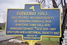 Borodino Hall, also known as Borodino Grange Hall, is a building in the hamlet of Borodino, New York. It was listed on the National Register of Historic Places in 2006.[1] Borodino Hall was built in 1835 by the First Religious Society of Borodino, and served as a church until 1868. It is a two-story building with a gabled roof on a high stone basement. It is of heavy timber-frame construction designed in the Federal style. The building was sold in 1868, and a stage was added to the interior around that time, converting it into a hall. In 1871, a performance of "Uncle Tom’s Cabin" was presented there by the Borodino Dramatic Society. At some time after this, the building became the Spafford Town Hall, a purpose it served until 1912. In that year the Grange chapter #1272 began meeting in the Hall, and they purchased it in 1919. Water service, a kitchen and restrooms were added in the early 1950s. The Spafford Area Historical Society purchased the building in 1997. It currently serves as a community center.[2]
