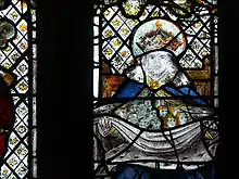 There were earlier images, common in the great French Gothic cathedrals of the 13th century, illustrating Abraham himself with small souls represented as children in his cloak, or held in a napkin in the same way as in the alabasters.[5] By "about the early fourteenth century" such images ceased to be "theologically acceptable",[6] though it seems this news had not reached Cornwall by the early 16th century, when a stained glass Abraham with a napkin of souls was installed in the parish church at St Neot, Cornwall (picture below).[7]