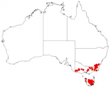 River leafless bossiaea grows in woodland and forest south from the Australian Capital Territory and the Southern Tablelands of New South Wales to scattered locations in Victoria and Tasmania.[2][4][5][9]