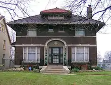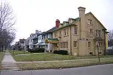 The first homes built in the Boston–Edison Historic District were occupied starting in 1905,[6] with the majority of the homes built between 1905 and 1925.[7] Each of the homes in the neighborhood is unique.[6][7] Architectural styles represented include English Tudor revival, Roman and Greek Revival, French Provincial, Colonial Revival, Italian Renaissance, Prairie Style, and Vernacular.[6] These homes range in size from modest two-story vernaculars to massive mansions set on sprawling grounds.[22] Although the homes are unique in style, homes along the streetscape are generally exhibit uniformity in roofline, scale, setback from the street, and the materials used, including stone, brick or wood construction.[23] This uniformity creates a gracious suburban ambiance.