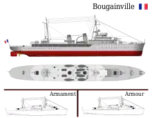 The anti-aircraft armament of the Bougainville class consisted of four 50-caliber Canon de 37 mm (1.5 in) Mle 1925 light AA gun guns in single mounts.[7] Their 0.725-kilogram (1.60 lb) shells were fired at a muzzle velocity of 850 m/s (2,800 ft/s). The guns had a range of 14,100 meters (15,400 yd) and a ceiling of about 10,000 meters (33,000 ft). They had a rate of fire of 30–42 rounds per minute.[8] The ships carried about 350 rounds for each gun. Short-range protection against strafing aircraft was provided by eight Mitrailleuse de 8 mm (0.3 in) Mle 1914 in four twin mountings. The ships were fitted with mine rails, one set on each side of the aft superstructure to allow them to lay defensive minefields. They could carry 50 Breguet B4 mines or a smaller number of larger Harlé H4 mines. They were also fitted with four minesweeping paravanes on the quarterdeck. The minerails could also be used to drop depth charges over the stern via trolleys; a total of 16 depth charges could be loaded on the rails.[9]