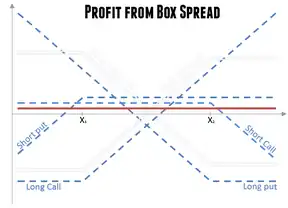 In options trading, a box spread is a combination of positions that has a certain (i.e., riskless) payoff, considered to be simply "delta neutral interest rate position". For example, a bull spread constructed from calls (e.g., long a 50 call, short a 60 call) combined with a bear spread constructed from puts (e.g., long a 60 put, short a 50 put) has a constant payoff of the difference in exercise prices (e.g. 10) assuming that the underlying stock does not go ex-dividend before the expiration of the options. If the underlying asset has a dividend of X, then the settled value of the box will be 10 + x.[1] Under the no-arbitrage assumption, the net premium paid out to acquire this position should be equal to the present value of the payoff.