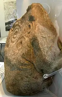 This is one of the nationally important Rombalds Moor cup and ring rocks. They were engraved in the neolithic era, and the larger engraved rocks have been left on the moor as it is thought that their meaning may be associated with the landscape. This more portable rock is in the museum for safety: the plough-marks on the rock indicate one of the reasons for this. The Heygate stone is one of the clearest examples of this type of petroglyph. A cast of the engraving reveals that the two larger ring-marks are superimposed on the others.[18] The stone was found in Near Hey Gate Field near Baildon by a local landowner on 25 September 2001, and it is believed that it was originally a rock with a larger area of 5000-year-old petroglyphs that had been quarried nearby in recent history, then dressed on two sides for wall-building. It is at the landowner's wish that the stone is preserved at the museum, as near as possible to its original site, because it cannot now be returned to the position where it lay in the neolithic era.[19]