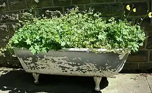 Here is an old bathtub full of wild flowers growing, and a safety cage for the now-disused entrance to the indoor beehive. Bumble bees still constantly try to use the entrance in early summer.[46][47] Wellington boots dry on the bench: it can be muddy here for most of the year.