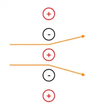 The concept behind the Bradbury–Nielsen shutter is to apply a high frequency voltage in a 180° out-of-phase manner to alternate wires in a grid which is orthogonal to the path of the ion beam. This results in charged particles only passing directly through the shutter at certain times in the voltage phase (φ=nπ/2), when the potential difference between the grid wires is zero. At other times the ion beam is deflected to some angle by the potential difference between the neighboring wires. This deflection is divergent with ions that pass through alternate slits being deflected in opposite directions. The maximum deflection angle [4] can be calculated by