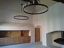 In the 16th century the dining hall was heated by an open fire in the centre of the room, supplemented by movable braziers. In the 1680s the hall was renovated, with a raised floor to accommodate a wine cellar below and a reconstructed roof. Another renovation phase in the mid-18th century included a new chimneypiece, a new ceiling to cover the original timber beams and two gilded chandeliers. The original brazen nose was placed above high table in 1890.[39]