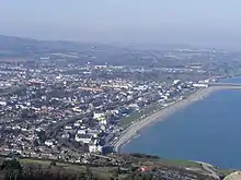 Bray (Irish: Bré [bʲɾʲeː])[2] is a coastal town in north County Wicklow, Ireland. It is situated about 20 km (12 mi) south of Dublin city centre on the east coast. It has a population of 33,512 making it the tenth largest urban area within Ireland (at the 2022 census).[1] Bray is home to Ardmore Studios, and some light industry is located in the town, with some business and retail parks on its southern periphery. Commuter links between Bray and Dublin are provided by rail, Dublin Bus and the M11 and M50 motorways. Parts of the town's northern outskirts are in County Dublin.[3]