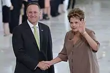 Official diplomatic relations between Brazil and New Zealand were established in 1964.[2] In 1997, Brazil opened an embassy in Wellington.[2] In November 2001, New Zealand Prime Minister Helen Clark paid a visit to Brazil, the first by a New Zealand Prime Minister, and inaugurated the New Zealand embassy in Brasília.[3] In 2010, a Working Holiday visa scheme was agreed between both nations.[4] In 2013, New Zealand Prime Minister John Key paid a visit to Brazil. His visit included an official meeting with Brazil's President Dilma Rousseff.[5]